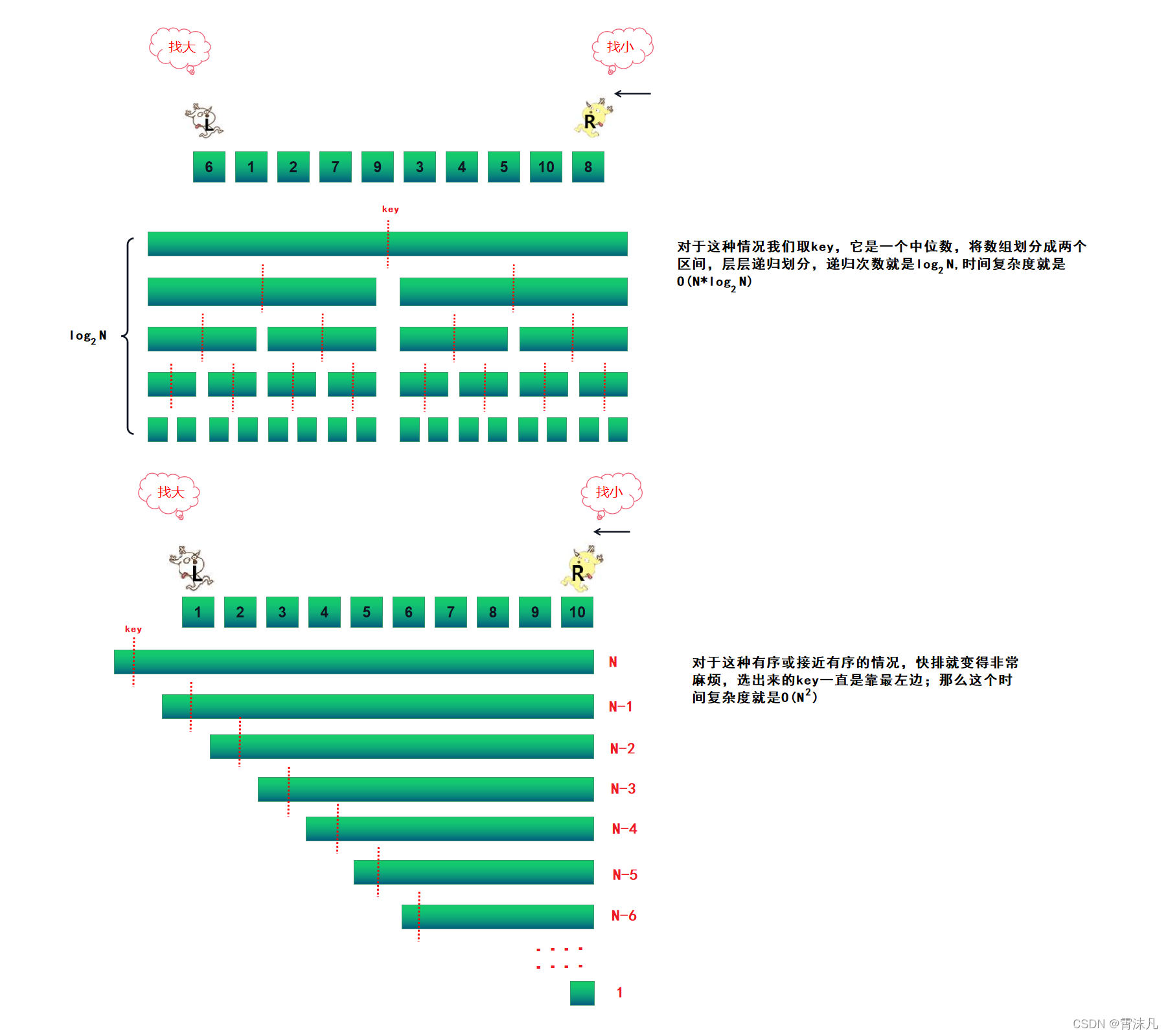 ** 先看下面的图例,发现快排在针对无序的数组进行排序时,它的效率是很快的,但是在有序或接近有序的情况下,就会变得很糟糕;这里最关键的就是key的选择问题; 也就是如何针对快排对于数组有序情况下选key的问题;**