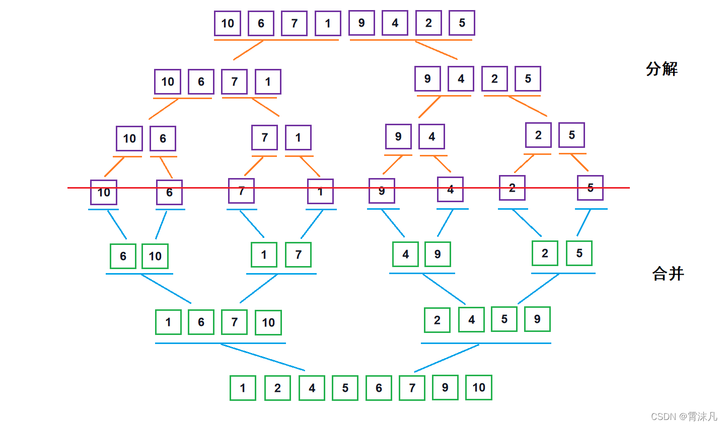 此时[ begin1, end1 ]=[ 8, 9 ],[ begin2, end2 ]=[ 10, 11 ];**[ begin2, end2 ]区间不存在元素,虽然在情况1的基础上将其修改为不存在的区间,但是[ begin1, end1 ]有两个元素,一个是2,一个是随机值,当数据入tmp数组时,会把这个随机值带入,并拷贝回原数组;此时数组已经越界,一定会存在错误;此时还要将end1修正为8(end=n-1),那么此区间就只有一个元素了,就不会出现数组越界的情况;**