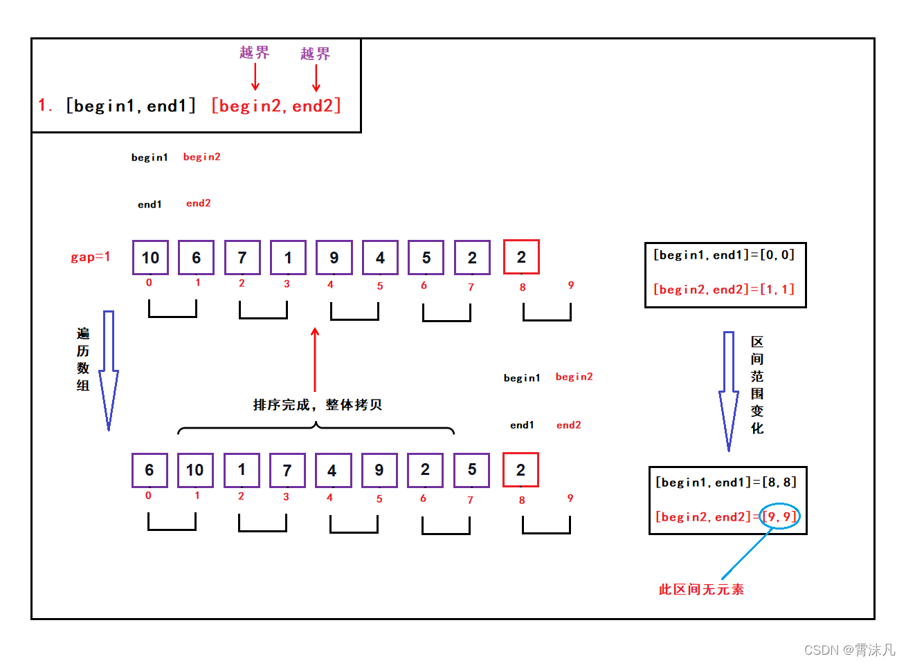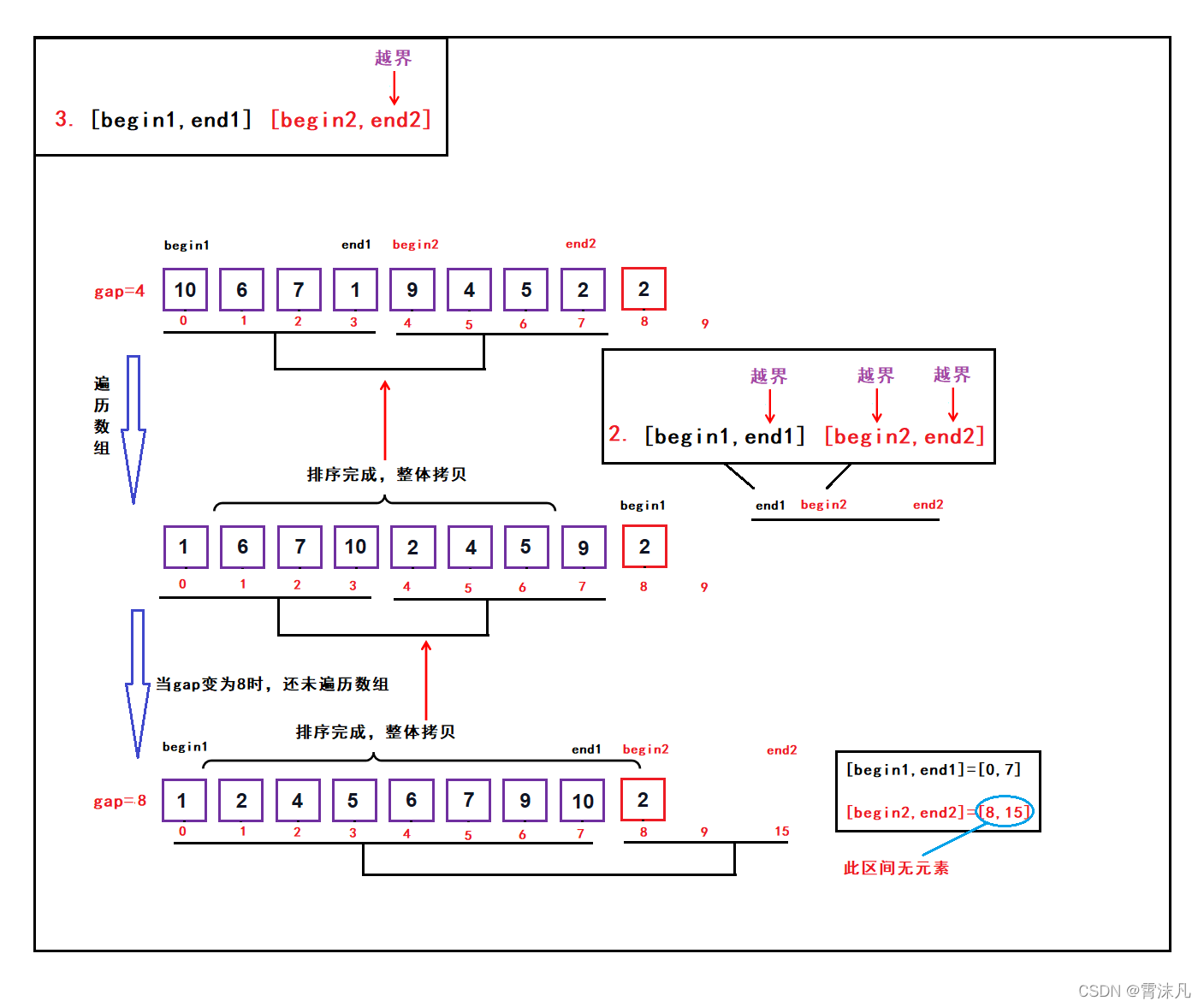 ** 这两种情况在end2修正后,end1和begin2存在越界,因为是归并一次数据就拷贝回原数组,所以并不会影响到原数组末尾的2;所以只要当end1和begin2越界时,让其不执行拷贝的操作就可以了(即代码实现时让其遇到此情况就跳出循环,去执行下一次gap分组)**