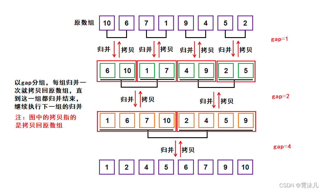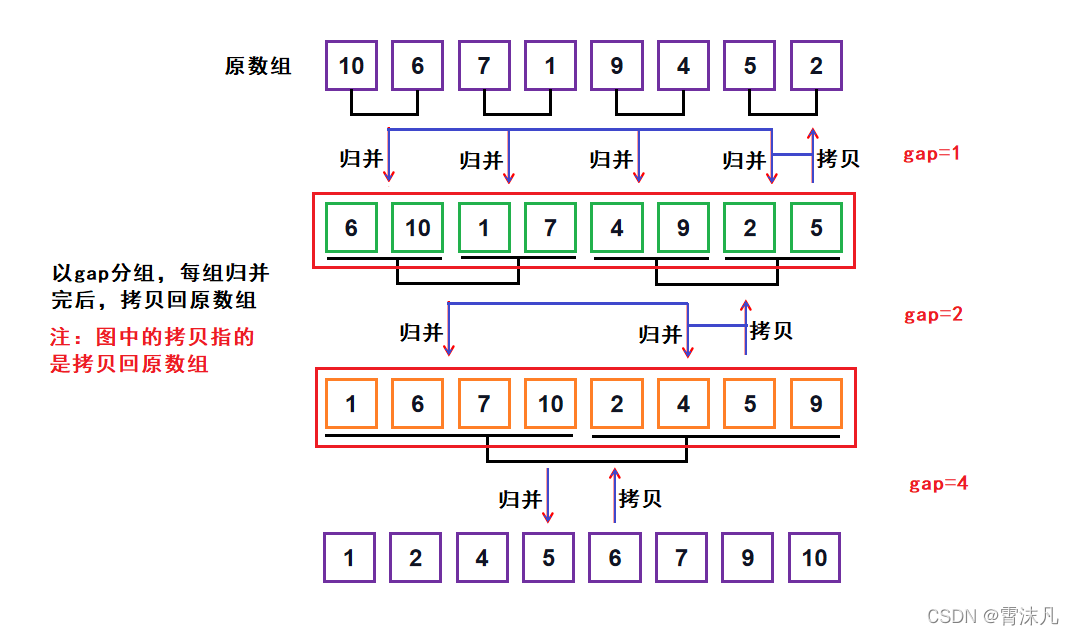**上图进行gap分组依次归并,可以看出:两个数据归并——>四个数据归并——>八个数据归并——>归并结束,排序完成;也就说明这种非递归的思想只适用于数组元素个数是2^n;**** 针对数组元素个数非2^n时,要对其边界进行控制,这也是归并排序的一个难点;整体的框架可能大家都理解,利用临时的tmp数组,然后把待排序数组拆分成两个数组,依次取遍历两个数组,哪个小就先入tmp数组,可能存在没入完的数组,再将剩下的全部入tmp数组;**