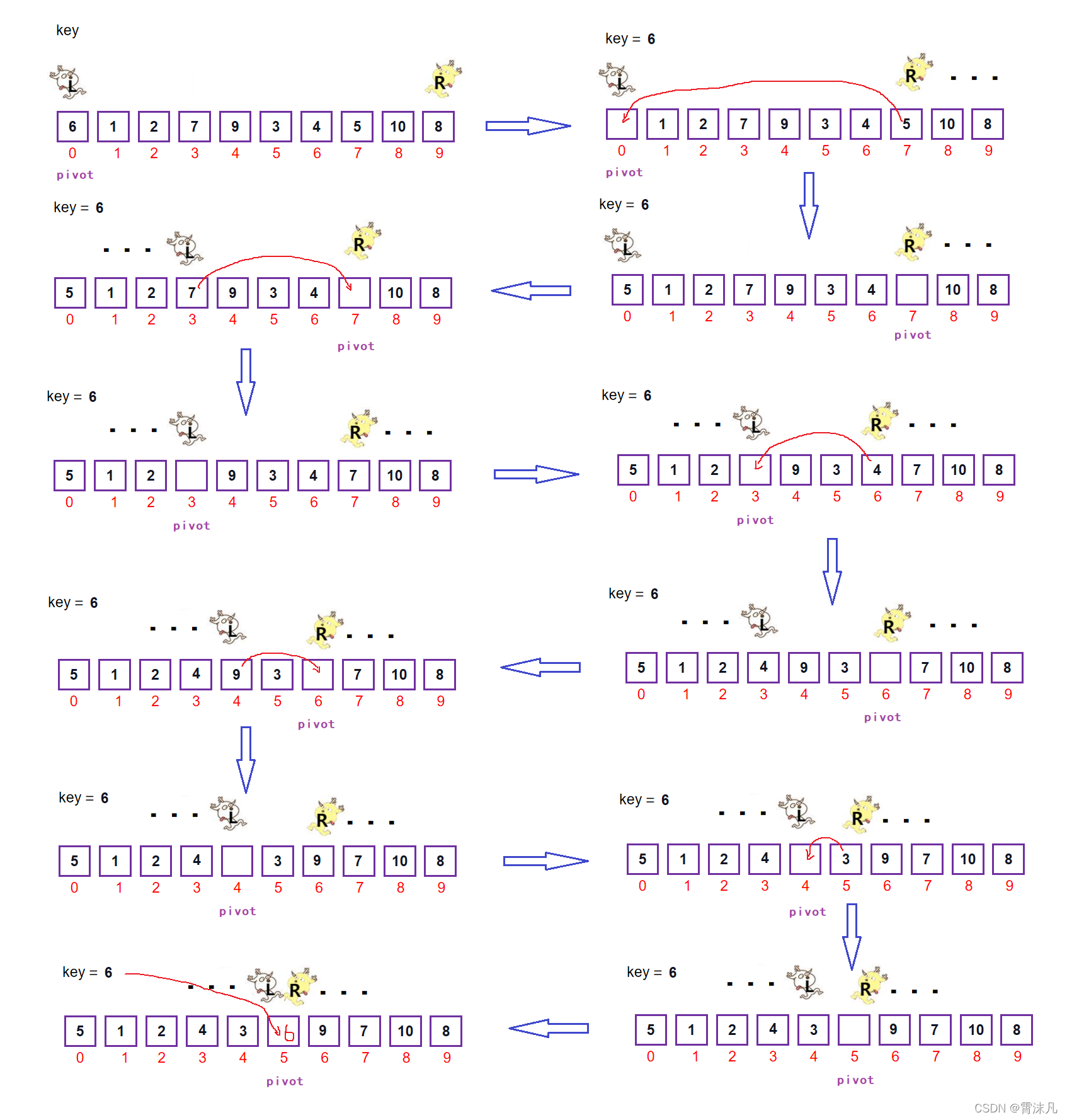 ** 先将第一个变量存储在临时变量key中,右边先走,去找小扔到左边的坑,自己成为新的坑;然后左边再走,去找大扔到右边的坑(pivot),自己成为新的坑(pivot);直到两者相遇把保存的key的值放进坑(pivot);**