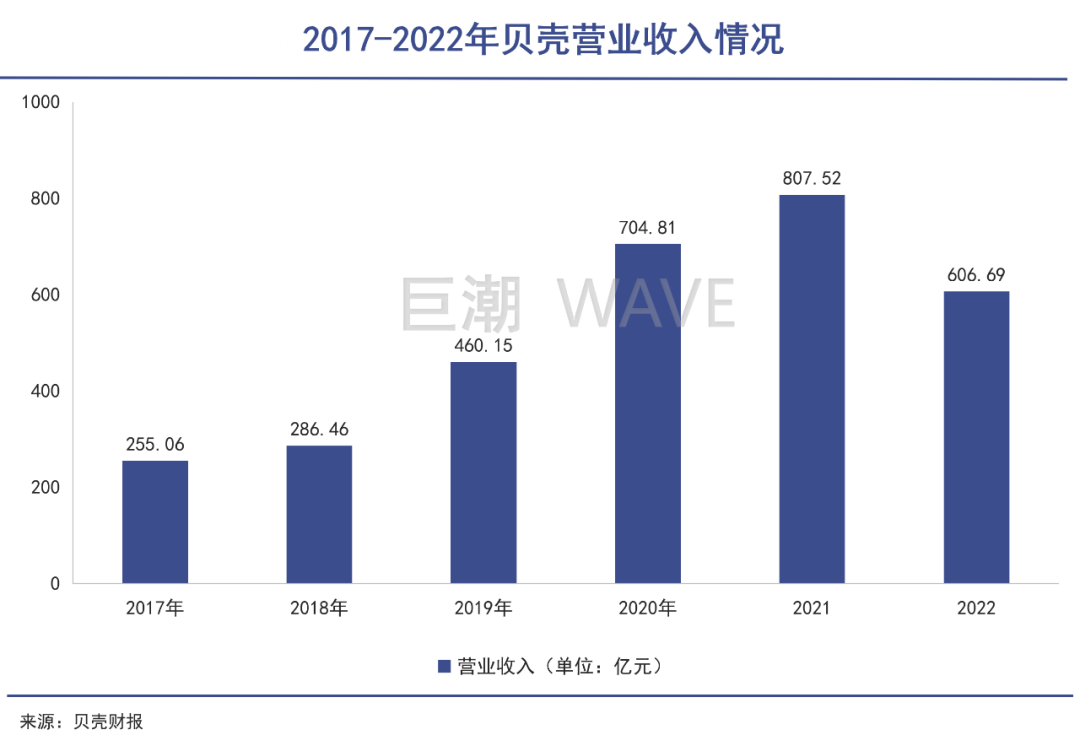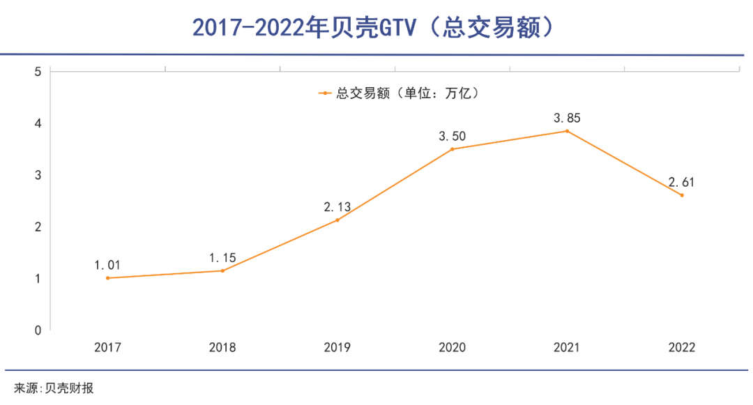 但这一切在2021年戛然而止。繁华过后,2021年的“三道红线”等严监管政策,让地产业跌入冰点。贝壳在2022年如履薄冰,营收萎缩到607亿元,GTV下滑至2.6万亿。