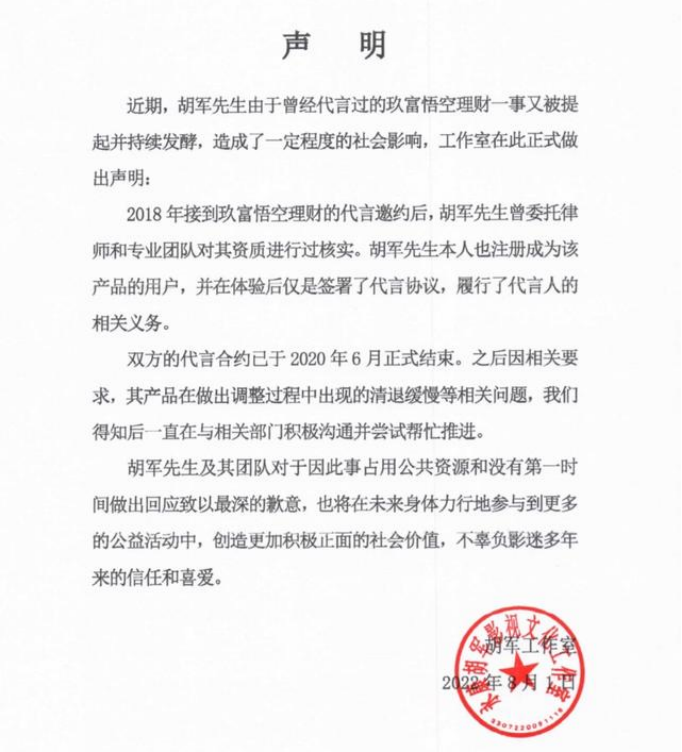 但是在暴雷之后,面对无数“受害者”的谩骂,明星最先做的往往是发一份千篇一律的声明。和平台撇清关系,表示一下已经解约。给被害者道歉、骂金主无耻,然后就没有然后了。从早先的汪涵、黄晓明,到最近的胡军、贾乃亮,无不是如此。