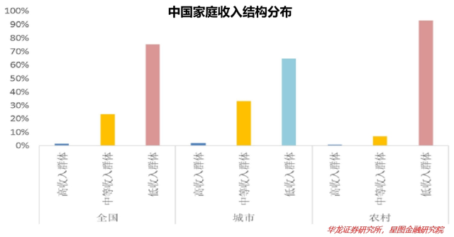 我国居民收入结构呈金字塔型分布,低收入群体数量占比最大,中等收入群体次之,高收入群体最少,类似金字塔尖。全国范围内看,中等收入群体仅有4亿人口,占比28.6%;城乡之间来看,城市中等收入群体人口占比更高,其中一二线城市约为53%,接近比较健康的橄榄型结构;农村地区的中高收入群体占比很低,以低收入群体为主,呈现出典型的倒钉子结构。