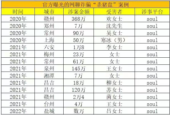 有媒体统计,近两年时间内,仅公安部门披露发生在Soul平台上的杀猪盘案例就有10余起,涉案金额从几万到数百万不等。最高的一笔金额甚至高达368万元,合计金额达897万元。