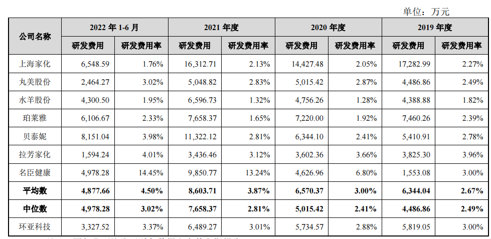不仅如此,在产品研发方面,环亚科技的研发费用也低于行业研发费用的平均值, 公司2019—2021半年度各期公司研发费用分别为 5819 万元、5735 万元、6489 万元和 3327万元,占营业收入比例分别为 3.00%、2.88%、3.01%和 3.37%。环亚科技最近三年一期研发费用累计为 2.1亿元左右。与上海家化三年一期5.39亿元的研发费用相比,具有较大差距。