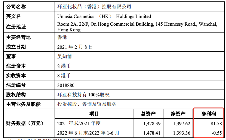 另一家子公司环亚化妆品,截至2021年底净利润亏损达到2220万元,净资产为-2780万元;截至2022年6月末,净利润转正为400余万元,但净资产依旧为负数。