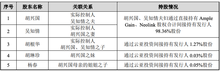 环亚招股书显示,环亚科技的实际控制人为胡兴国、吴知情、胡根华三人。其中吴知情为胡兴国之妻、胡根华为胡兴国之子,三人合计控制了公司98.36%的股份表决权,胡兴国家族对于企业而言具备绝对控股地位。