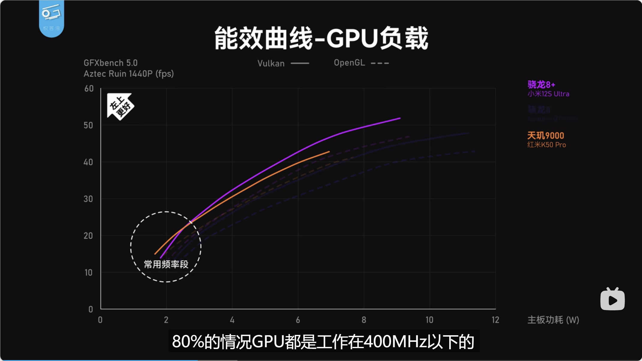 GPU 部分,高通自研架构还是有明显的优势,大部分频率下骁龙 8+ Gen 1 功耗都低于天玑 9000,极限性能也高于后者。不过,考虑到即便是大部分手游对 GPU 的性能需求也较低,具体到日常体验中,未必如能效曲线中表现得一边倒。