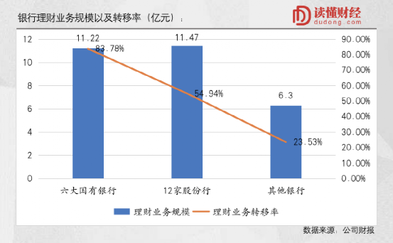 可以看出,头部银行的理财业务转移率非常高,而中小银行的理财业务转移率非常低。