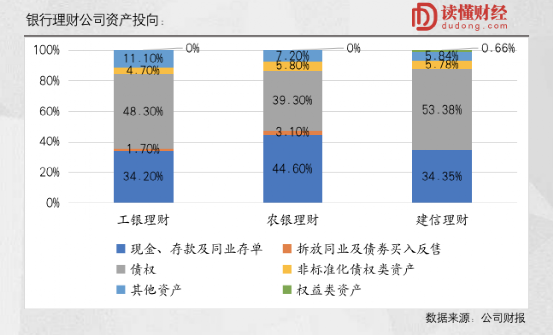 以2021年工银理财、农银理财、建信理财3家头部理财子公司披露的数据看,理财资金的投向主要是固收类,占比约90%,而混合类、权益类及金融衍生品类等资产占比只有约10%。具体来看,三家银行非标债权类资产和债券类资产占比分别在4-6%和40-60%之间,现金、存款、同业存单、拆放同业及债券买入返售等资产占比在35-50%之间,其它类资产和权益类资产占比在0%-11%之间。