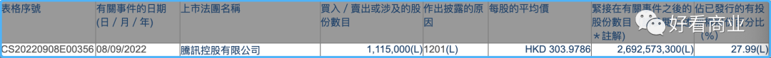 据港交所披露,这次减持发生在9月8日,Prosus以303.9786港元/股的价格减持1115000股腾讯股票,共套现约338936139港元,约合4318万美元。
