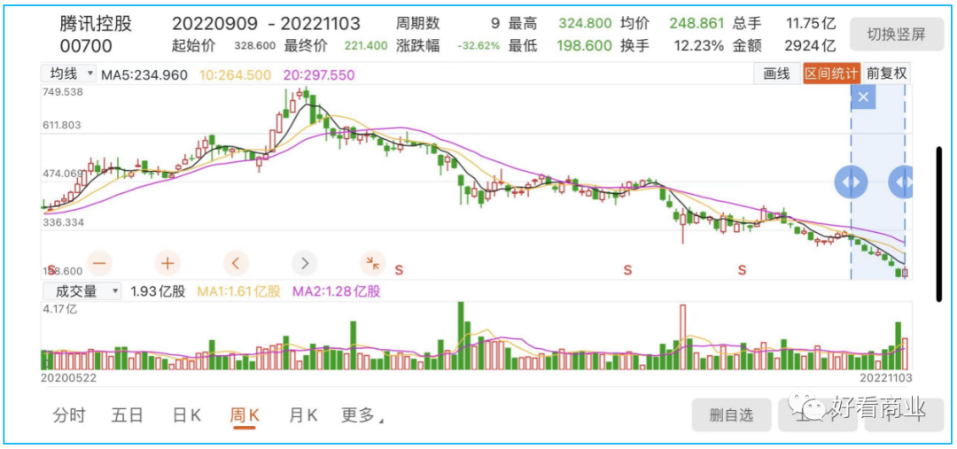自9月9日起,腾讯股价进入快速下跌通道,最低触及198.6港元,腾讯市值在也过去不到2个月时间里缩水约7700亿港元。