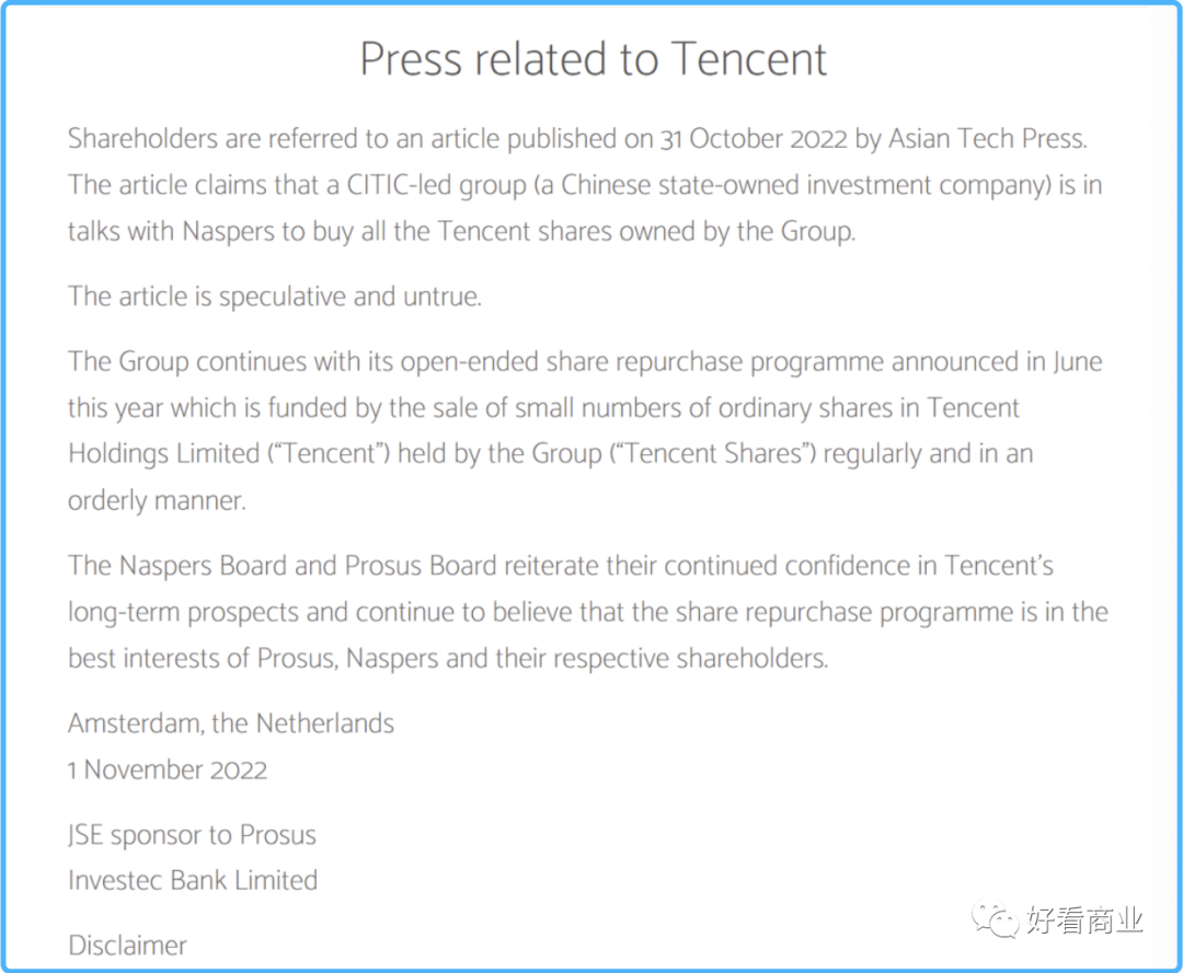 11月1日,腾讯大股东——南非Naspers集团的子公司Prosus发布声明称,媒体公司“亚洲科技”(Asian Tech Press)10月31日的文章称中信集团正组团与Naspers谈判以收购其持有的全部腾讯股份,该文是猜测性的,不符合事实。Naspers董事会和Prosus董事会重申,他们对腾讯的长期前景仍有信心。