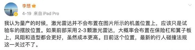 李想表示,激光雷达放在车顶还是放在机盖和保险杠上,从性能上没有任何区别。但车顶激光雷达的造型需要适应。他表示,量产的时候,激光雷达并不会布置在机盖位置,大概率会布置在保险杠和翼子板上,风阻和造型都会很好,虽然成本很高,但是合规范围内只能这么做。