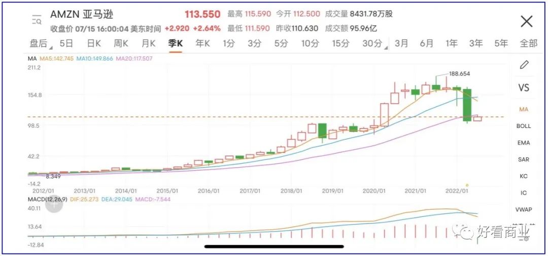 自2021年下半年开始,亚马逊股价结束多年来一路上涨的趋势,掉头向下。