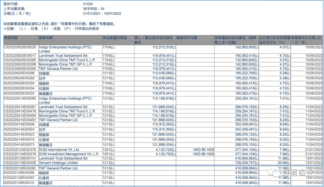 2022年1-6月,多家投资机构减持快手。其中,刘芹、石建明及他们管理的晨兴资本(已更名五源资本)多次减持快手。