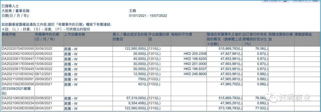 据港交所权益披露,6月14——6月20日的4个交易日内,王兴持续卖出美团美团B类股,累计卖出12.6万股,共套现约2500万港元(约合人民币2150万元)。