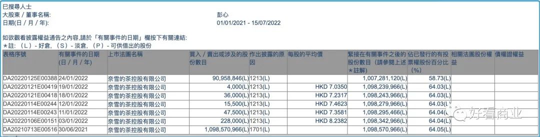 截至今年1月24日,彭心在奈雪的持股比例降至58.73%。