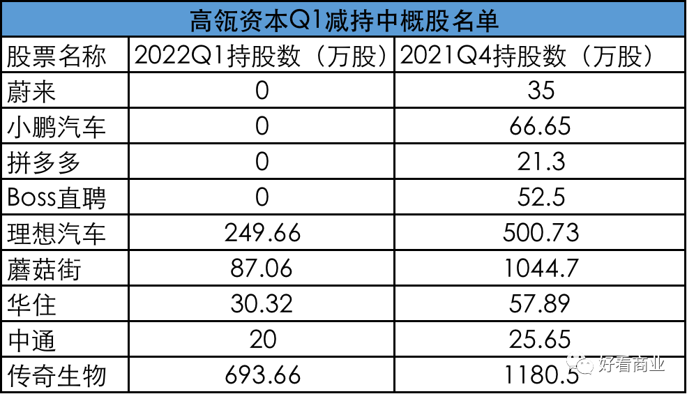 同时,高瓴还在一季度减持了其它一些中概股,其中包括理想汽车、蘑菇街、华住、中通、传奇生物。