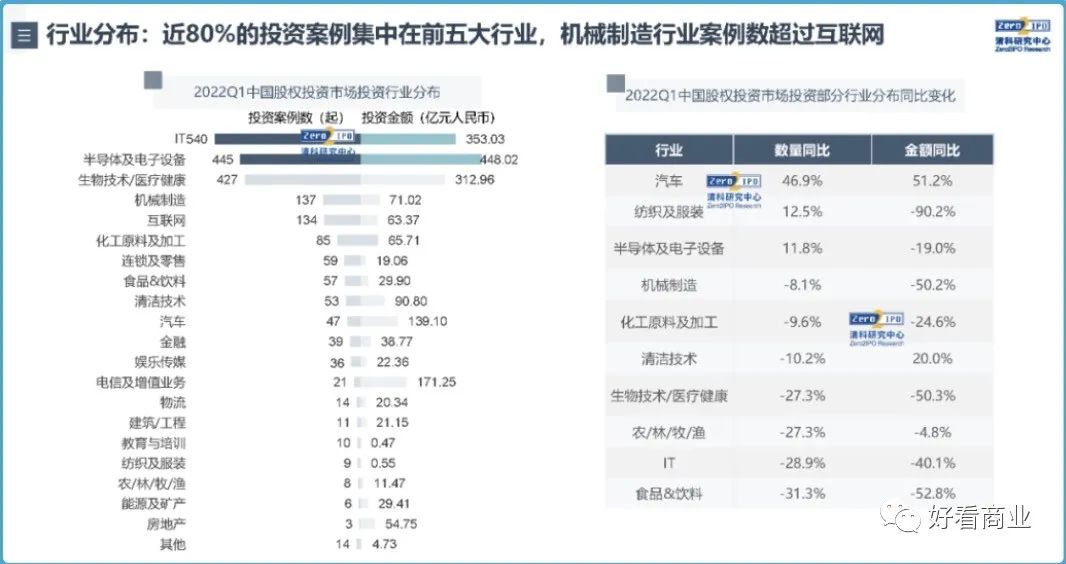 其中,近80%的投资案例集中在前五大行业,包括半导体及电子设备、生物技术/医疗健康、机械制造、互联网、化工原料及加工。