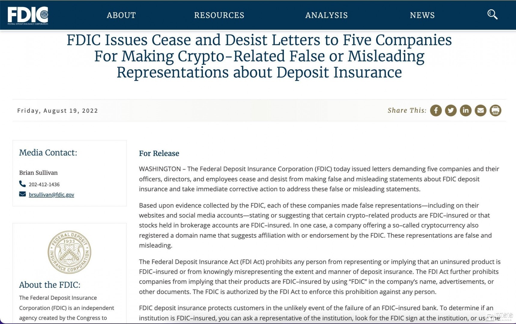 当地时间8月19日,美国联邦存款保险公司 (FDIC) 已向五家公司发出停止令,要求他们停止对加密货币的存款保险作出的虚假陈述行为。