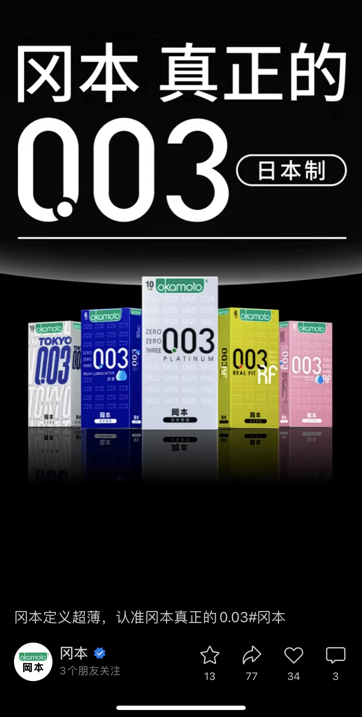 冈本关注更多的,是不同消费者群体对于愉悦性体验的细分需求。在0.03数字薄的基础上,给安全套加入芦荟、透明质酸等润滑材料,针对海内外市场及不同消费群体,推出热感安全套、冷感安全套、浮世绘限定版安全套、不沾双手的拉丝带安全套以及 0.03HIV预防安全套等多种创新产品。