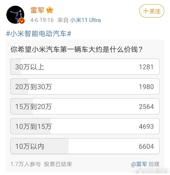 雷军曾在自己的微博上就小米汽车定价做过用户调研,粉丝反馈表明他们最期望的价格区间是10万元以内,再往上支持者人数就随着价格梯度逐级递减了。当然,雷军的解读也很刁钻,这说明“2/3的米粉希望我们做中高端汽车,因此第一款小米汽车价格区间为10万-30万元”。