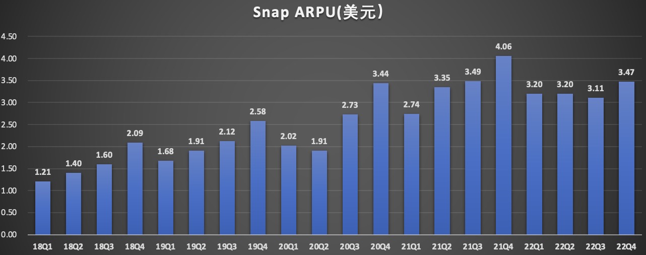 另外一个衡量平台用户收入的关键指标是ARPU值,Snap的ARPU值已连续三个季度同比下滑。数据显示,2022年第四季度,Snap的ARPU值为3.47美元,相比上年同期的4.06美元,下滑15%。
