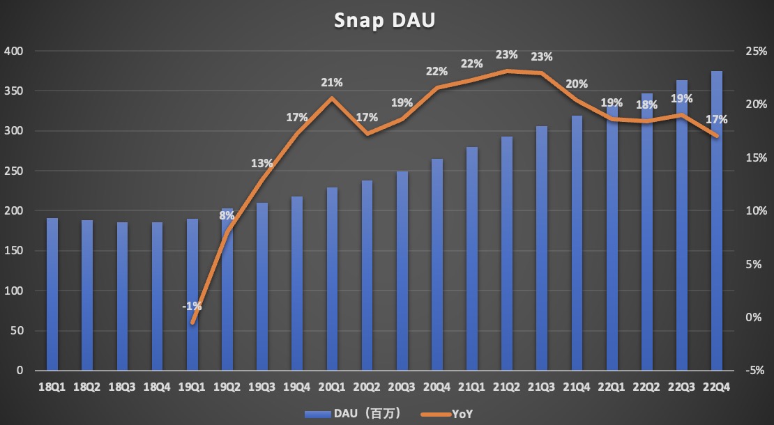 用户是社交平台的重要衡量指标。Snap每日活跃用户同比增速也在放缓。财报显示,Snapchat第四季度日活用户(DAU)为3.75亿,同比增长17%,低于上一季度19%的同比增速,以及上年同期20%的同比增速。