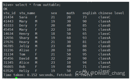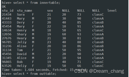 从表中查询数据(图5 内部表数据 ,图6 外部表数据)出现null值是我建表的字符分割的时候没有将格式写正确。