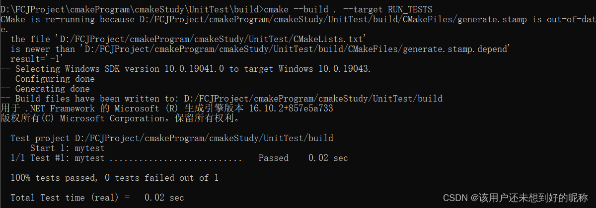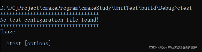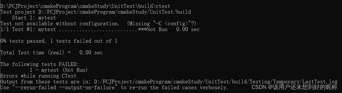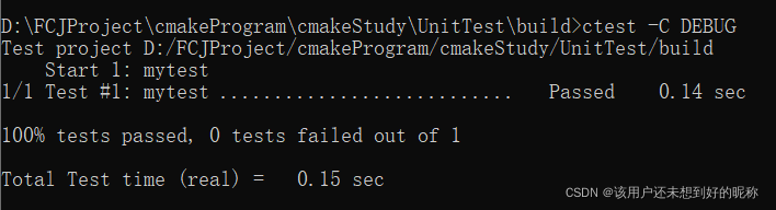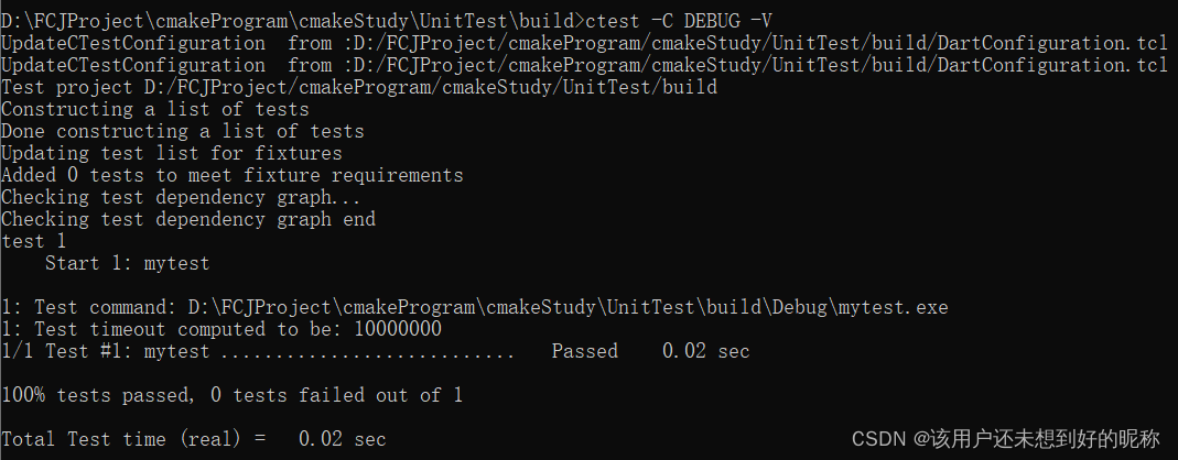 使用ctest命令时,必须加上编译类型 **-C <config>**参数 ,才可以正确执行。默认情况下只有 **Passed/Failed** 提示信息,此外,我们可以添加以下命令: