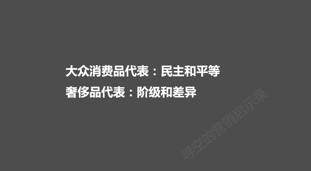 奢侈品几乎从不做促销广告,它从来不靠降价促销、大声吆喝等方式吸引消费者购买商品,它靠的是一种无形的社会压力,这种压力是——打造自己最高级商品的形象,让最上层的人士购买和使用,商品在社会中形成一种高贵的象征,从而对没有这些商品的消费者形成巨大的心理压力,让他们产生焦虑。
