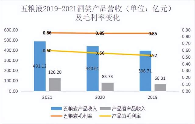 2019-2021年三年中高端的五粮液产品营收收入占比逐年下降,从86%下降到了80%,而五粮液产品的营收增速和毛利率稳定在11%和85%左右,而系列酒产品的营收出现了快速增长,2020年、2021年同比增长分别达到了26%和51%,有着逐渐去高端化的趋势。