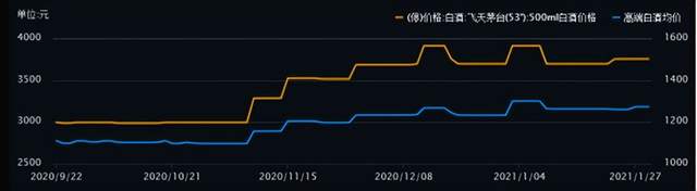 评价一款白酒是不是高端品牌,最直观的是产品价格与主打产品的保值能力。从同花顺的数据中可以看到,**贵州茅台的代表产品53°飞天茅台始终处于一个较高的价格段位,其他高端产品走势也基本趋同(2020.9.22至2021.1.27)**。