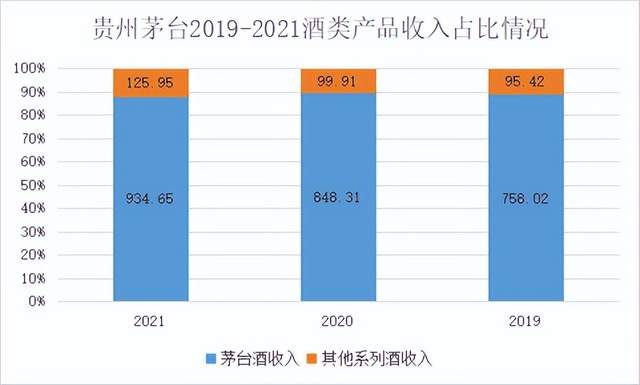 贵州茅台年报中披露,公司酒类产品按档次可以分为两大类,分别是高端档的茅台酒和其他系列酒,2019-2021年三年中高端的茅台酒收入一直占比接近90%,且毛利率高达94%,因此造就了贵州茅台整体超过90%的超高毛利率。此外,中低端档次的其他系列酒的也要比五粮液的产品酒毛利率高20个百分点左右。毫无疑问,贵州茅台的品牌溢价能力远高于五粮液。