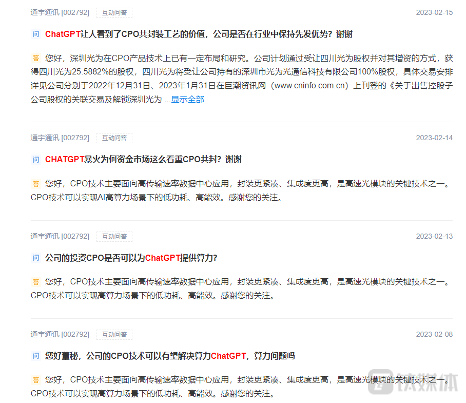 此后一段时间内,通宇通讯频频在互动易平台积极正面回应关于ChatGPT、CPO的相关问题,诸如“公司的投资CPO是否可以为ChatGPT提供算力”、“ChatGPT让人看到了CPO共封装工艺的价值,公司是否在行业中保持先发优势”等等。仅2月就答复了多达20余条关于CPO的内容。值得注意的是,2月2日通宇通讯曾在互动易平台明确表示暂不涉及ChatGPT技术,但在此后相关回复中却再未予以明确否认。