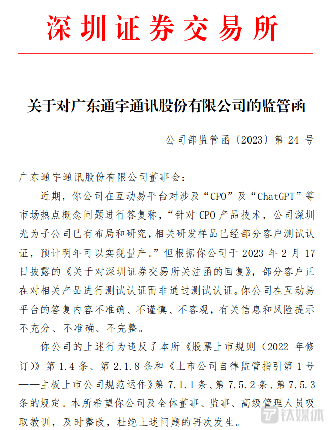 今年以来,ChatGPT在A股市场可谓风光无限,各行业想尽办法蹭上热度,不过相关“蹭热点”的公司也相继引起监管部门的注意。3月6日晚间,通宇通讯(002792.SZ)因CPO及ChatGPT等概念的答复内容不准确,收到了深交所的监管函。