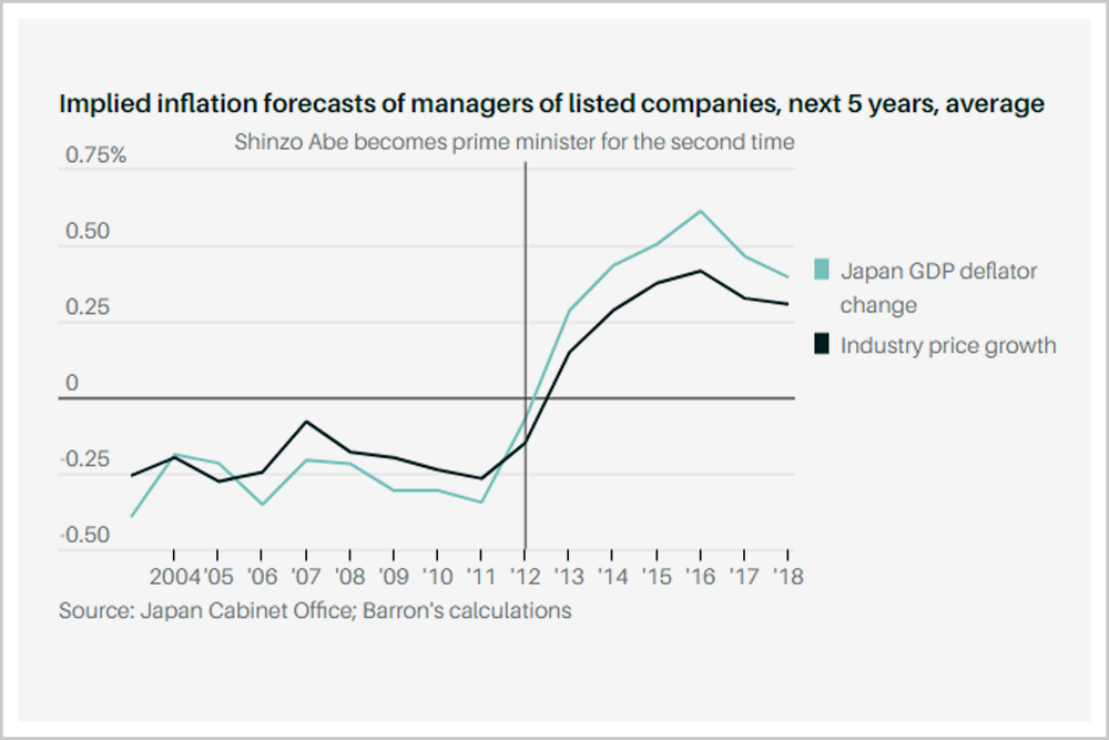 日本消费者物价水平,几乎在安倍上任后立刻触底反弹,此后一直缓慢爬升。上市公司经理人对于通胀的预期,也从之前长期的通缩,转为轻微的通胀。