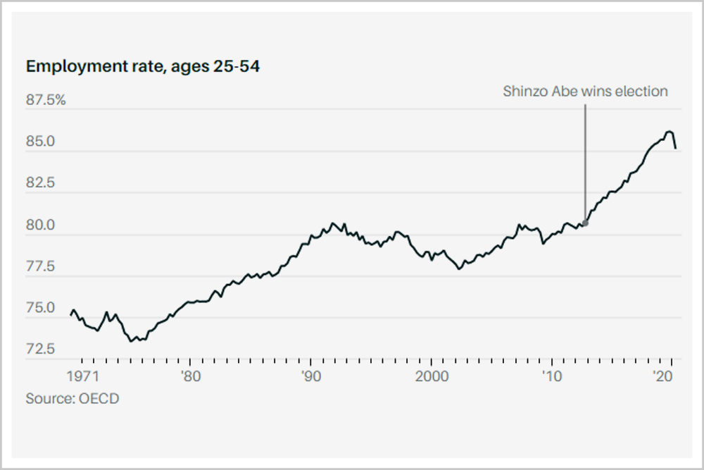 股市飙升的背后,是人们对经济信心的恢复。事实上,尽管经历了数十年的停滞,但在安倍任职期间,日本仍增加了550万个就业岗位。