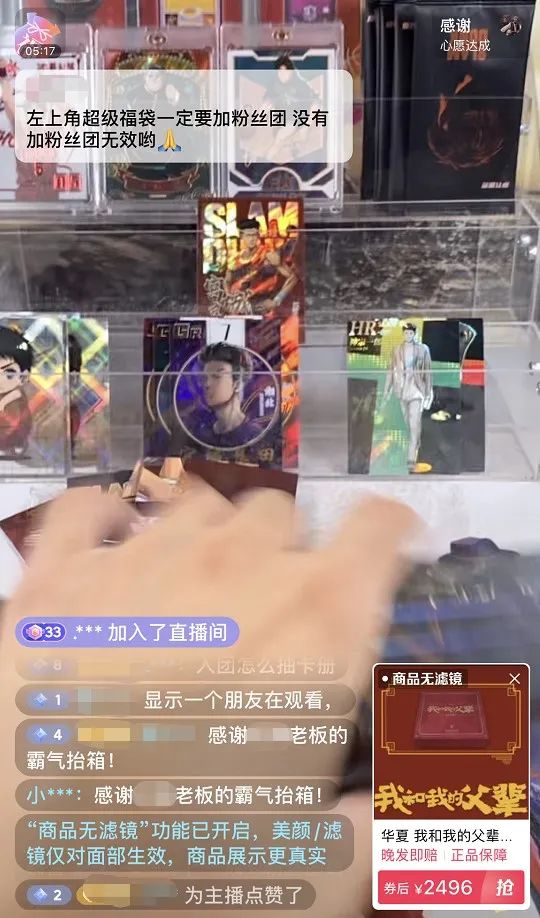 一张桌子,搭配一个透明亚克力板材质的置物架,再加上主播的一双手以及他拿着的一叠花花绿绿的纸卡,成了诸多拆卡直播间的“标配”。其中,部分主播提供的观看内容可能会更“丰富”一些,比如正对着一面镜子进行直播,让观众可以在体验“云拆卡”刺激感的同时,一览主播真容。