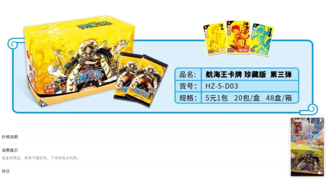 所以,“对于很多老玩家而言,经典卡片已经收集的差不多了,他们还是比较期待有一些新的卡牌出现。”就像已经出到了第三弹的海贼王,作为一个长盛不衰的经典动漫IP,卡牌样式虽然推陈出新再出新,依然能借着情怀成为很多拆卡直播间中必不可少的货源之一。