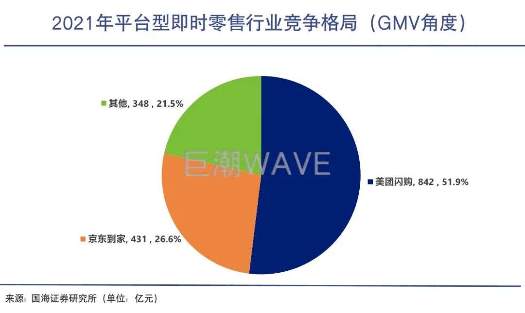 据美团CFO陈少晖在2021年业绩电话会上透露,2021年美团闪购年交易用户达到2.3亿,总交易额达到了外卖的12%(约842亿元)。这一数字已经超过了京东到家截至2022年3月31日的12个月内的平台总交易额(491亿元)。