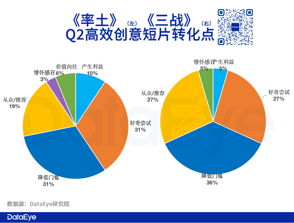 在转化点上,《率土》二季度高效素材可谓丰富,主要以【好奇尝试】原则,即一句“旁观谍战,还是深入局中?”作为新玩法吸引用户的钩子。其次,还大量解读游戏玩法、策略、选择,希望降低用户心理门槛。作为对比,一季度《率土》主推“真实天气系统”,主要通过【好奇尝试】原则引发转化。而《三战》二季度高效素材同样丰富,与《率土》的主要差距在于明显【从众推荐】的情况更多。