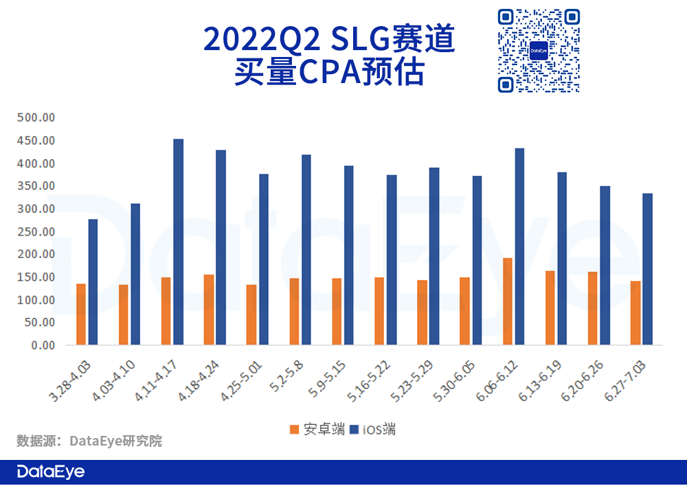 根据DataEye研究院数据,策略类CPA在第二季度只增不减,其中安卓端CPA较一季度提升,目前接近150元/A。iOS端在4月中旬开始,CPA持续维持高位横盘,这主要因为个别产品上线后开始加大投放量,财大气粗强势“搅局”,SLG赛道进入门槛继续提高。