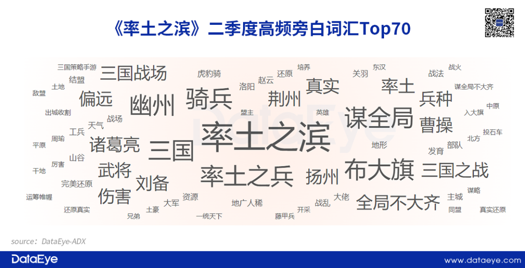 与此同时,《率土》二季度买量素材高频旁白TOP70,变成了“骑兵”、“诸葛亮”、“荆州”、“刘备”、“曹操”等,更贴近三国人物,也更贴近三国用户熟悉的元素。作为对比,一季度《率土》高频旁白TOP70为“城建科技”、“百万大军”、“资源”、“连续暴雨”,则更偏向游戏产品本身。