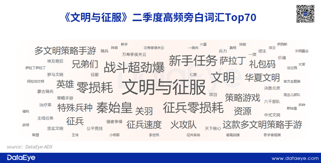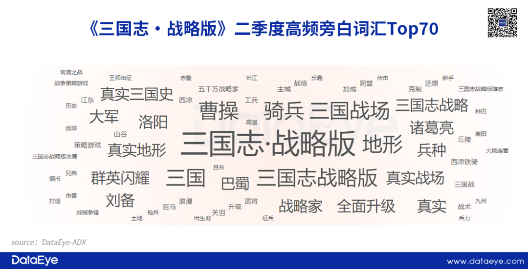 《三战》二季度买量素材高频旁白TOP70,仍是“真实三国史”“真实地形”“战略家”等。这与一季度高频旁白差距不大。