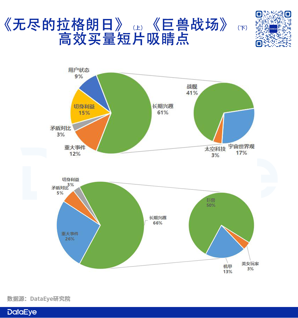 ②通过品牌广告片的补充,提升产品的品牌调性,例如《无尽的拉格朗日》会采用太空科幻题材+电影级美术的结合,而《巨兽战场》则突出远古巨兽的凶残,加深题材用户的印象。