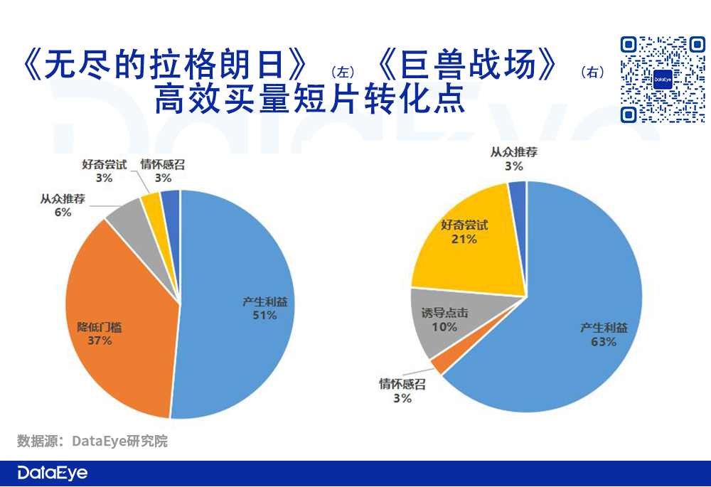 创新性题材产品卖点侧重于放大题材卖点,吸引更多题材爱好者关注。《无尽的拉格朗日》从太空战舰转移到宇宙世界观,而《巨兽战场》更突显题材的凶残;效果型达人营销方面,侧重于娱乐化的创新题材,更吸引达人创作,效果也相对明显。