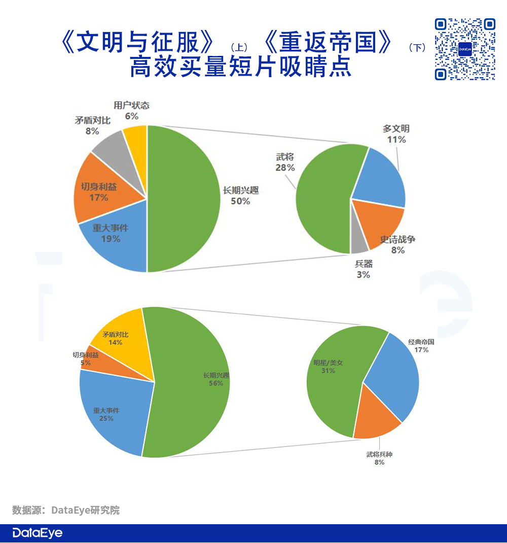 《文明与征服》二季度依然强调底氪度的效果型卖点;《重返帝国》加强了定位诠释,挖掘产品特点,升级Slogan,但营销方式上能做的有限。